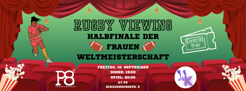 Freitag, den 19. September wird also das Halbfinale der Frauen Rugby Weltmeisterschaft in der P8² auf einer großen Leinwand gezeigt. Das Spiel fängt um 20 Uhr an, aber kommt gern schon ab 19 Uhr, um etwas zu trinken oder einfach zu chillen! Die Bar ist geöffnet und Snacks sind angerichtet. Die queer- feministische Gruppe ,,Weiche Kanten’’ ist auch dabei.